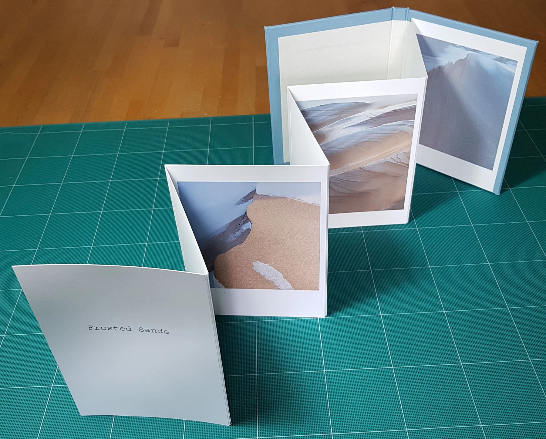 Details: Hard backed concertina book with 7 images; h 110mm x w 180mm extending to 500mm; front and back covered with Japanese Chiyogami paper; interior printed on Bockingford watercolour paper 190gsm using dye-based ChromaLife100 inks; individual prints connected with handmade hinges to form concertina.