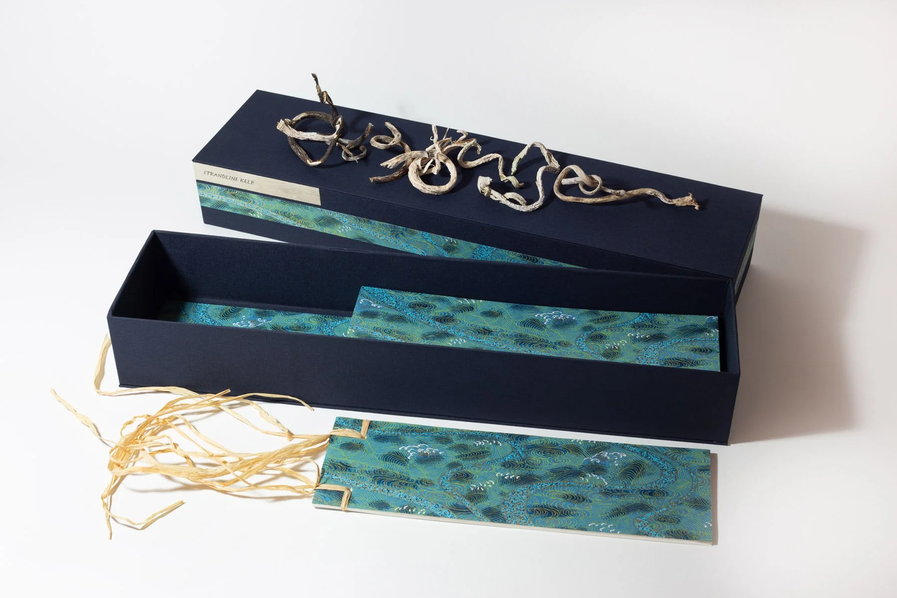 PRESENTATION BOX is a handmade partitioned box to hold the triptych of books and the project book. Box dimensions: h 375mm x w 505mm x d 110mm. Covered in 100% cotton book cloth - Atlantic Gulf. Interior walls covered in white jaconette calico. Lines with Daler Rowney white fine grain paper.
